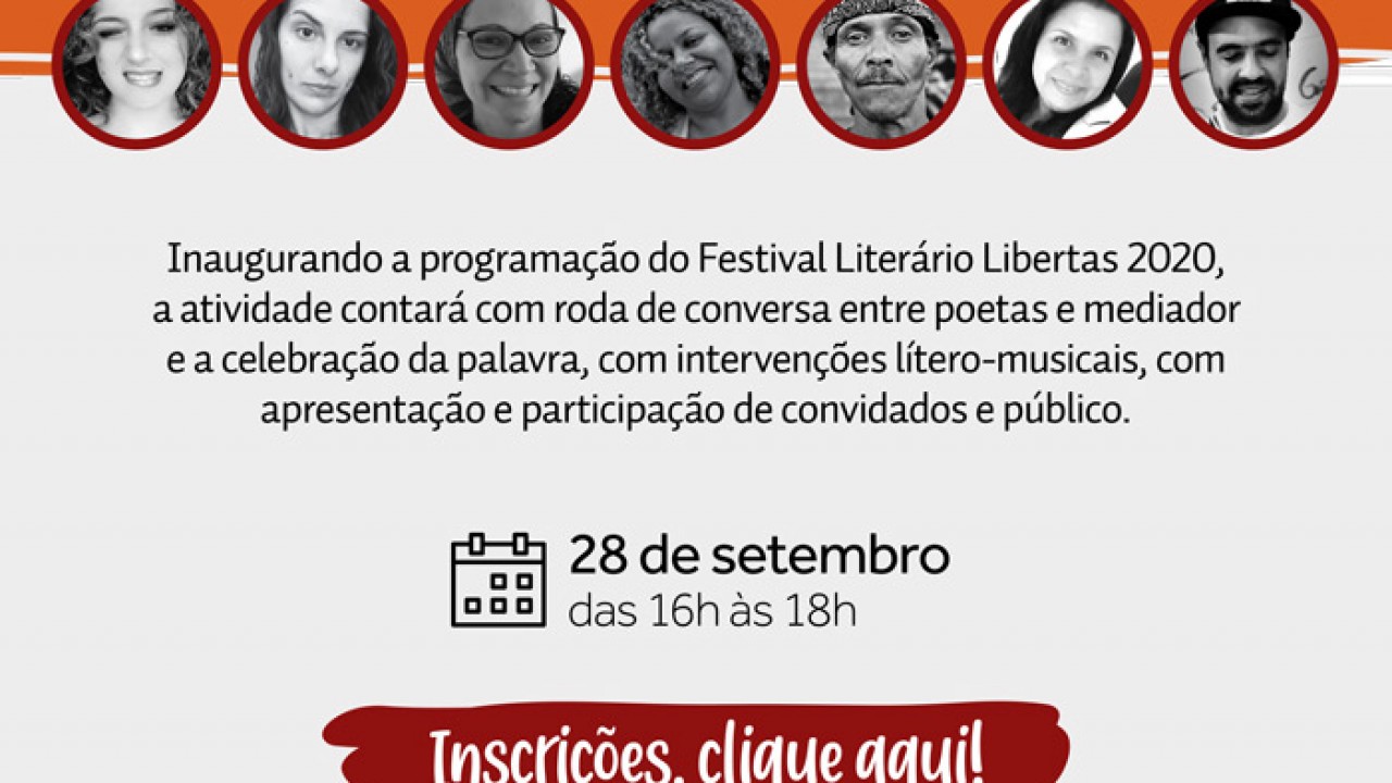 Vem aí sarau online! Trata-se de participação da sua Biblioteca de São Paulo na programação do Festival Literário Libertas 2020. O evento está marcado para 28 de setembro e terá mediação de Renan Inquérito.