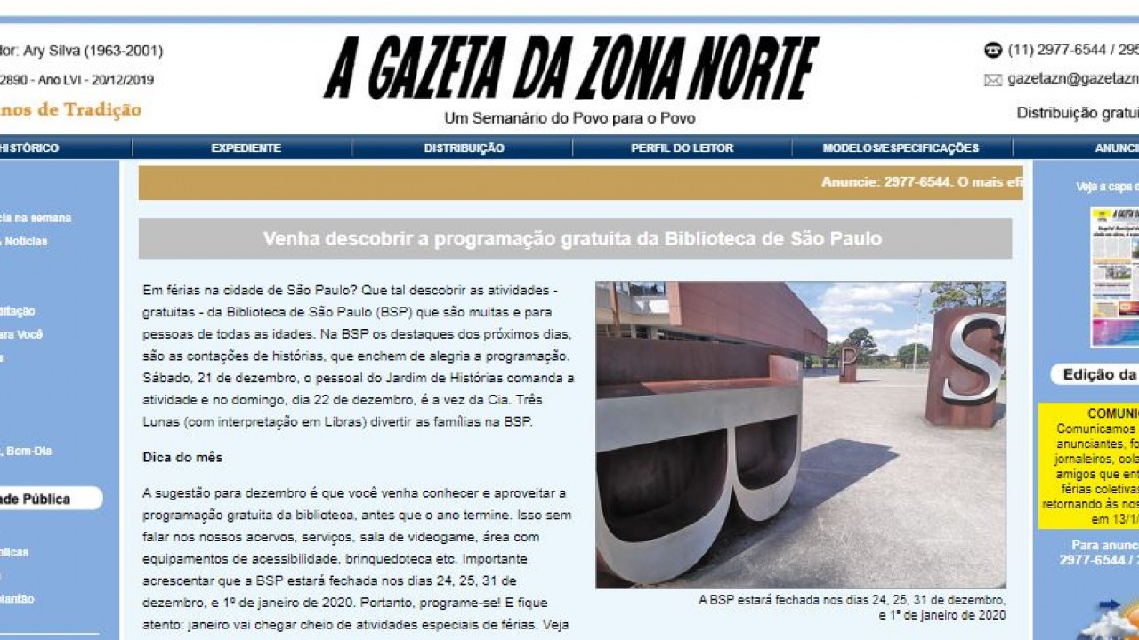 A Gazeta da Zona Norte publicou, no site e na versão impressa, a programação dos próximos dias na BSP. Confira, clicando aqui.